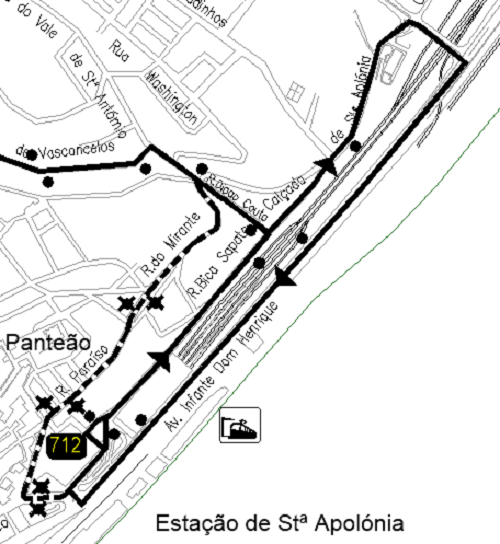A carreira 712 circula, a partir do terminal, via R. Bica Sapato, R. Diogo Couto e R. Leite Vasconcelos.